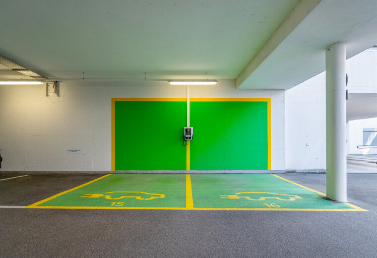 Reichlich Parkplätze im eigenen Parkhaus, Parkfelder für Motorräder und Ladestationen für Elektroautos. Alles vorhanden.